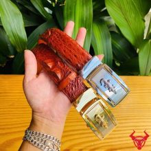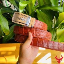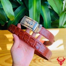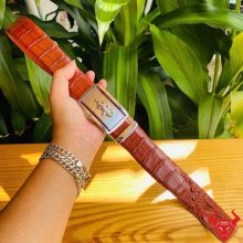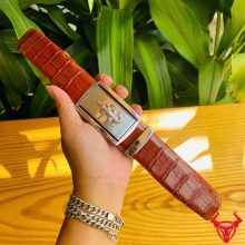 Mẫu thắt lưng cao cấp được chế tác từ da cá sấu thật, gam màu nâu đỏ ấm áp cùng khóa trắng sáng bóng, mang lại vẻ ngoài thanh lịch, sang trọng và thời trang.